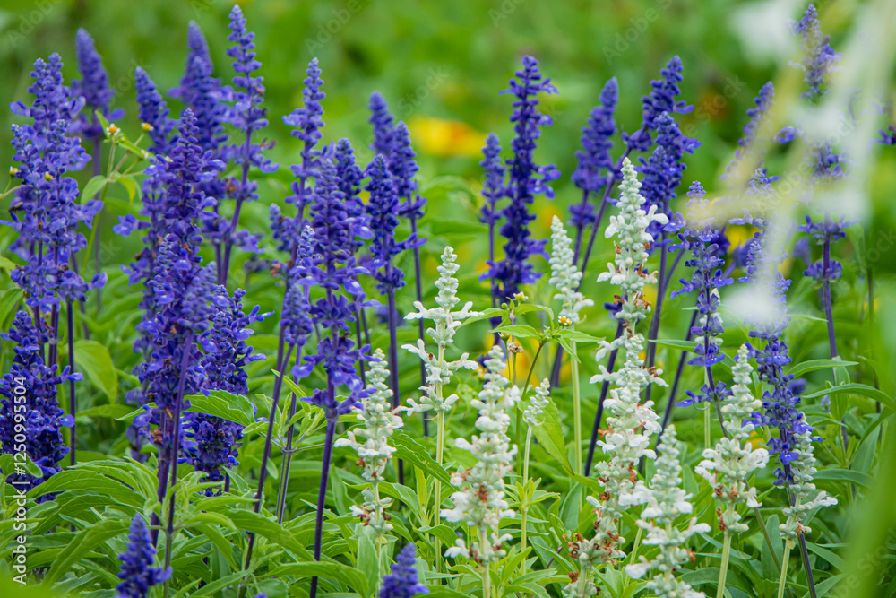 Vibrant Floral Display in a Sunlit Garden Showcasing Purple and White Blooms Swaying in the Gentle Breeze, Capturing the Essence of Springtime Beauty and Serenity