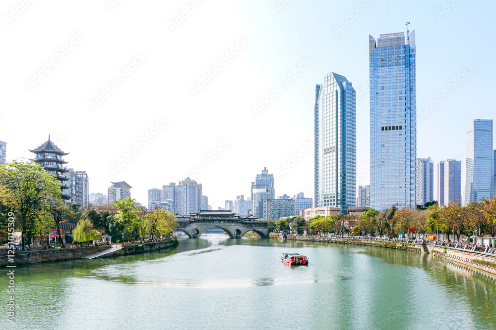 Beautiful and iconic cityscape view of tour boat about to cross the ancient Anshun Bridge on the Jinjiang River in Chengdu with modern skyscrapers and buildings in the background