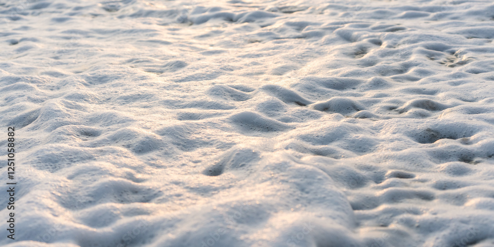 Close-up of a coral sand beach with white sea foam washing up and resting on the surface.