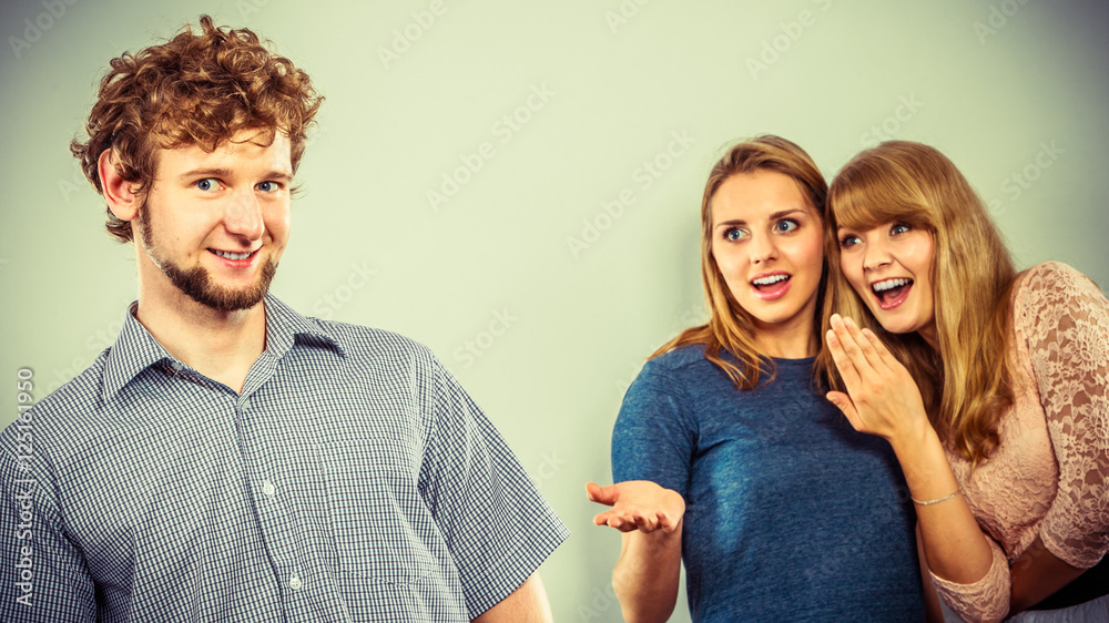 Two women talking gossiping about man.