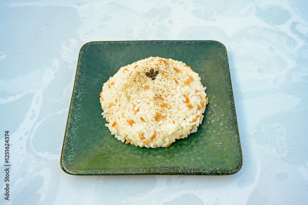 Traditional delicious Turkish food; Turkish style rice pilaf (Turkish name; Arpa sehriyeli. tavuk, kuru fasulyeli, pirinc pilavi). Cigerli, kavurmali, tereyagli nohut pilav.
