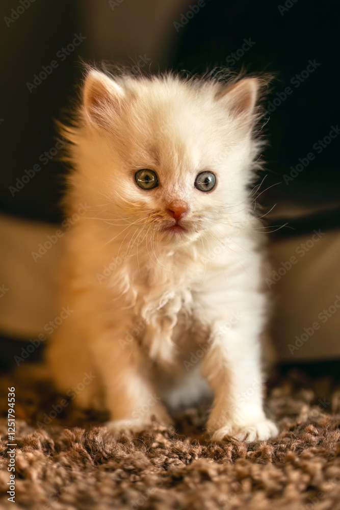 A cute ragdoll mix crossbreed kitten playing indoors. Four weeks old kitten portrait