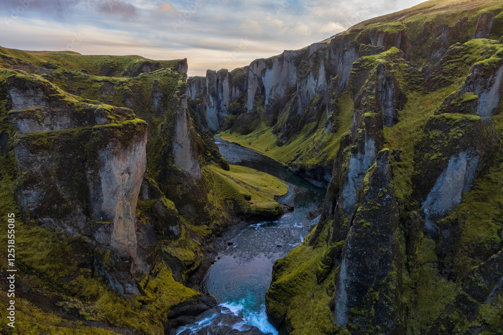 Birdview of Fjadrargljufur canyon with a river meandering through the middle of the canyon. Color landscape in a famous place in Iceland. Scenic nature environment.