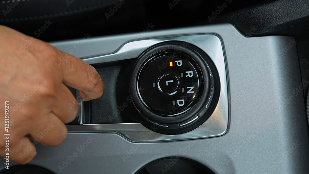 Woman's fingers activate the Hand brake in the car. Close-up view in the vehicle, the electric parking brake. Driving modern car.