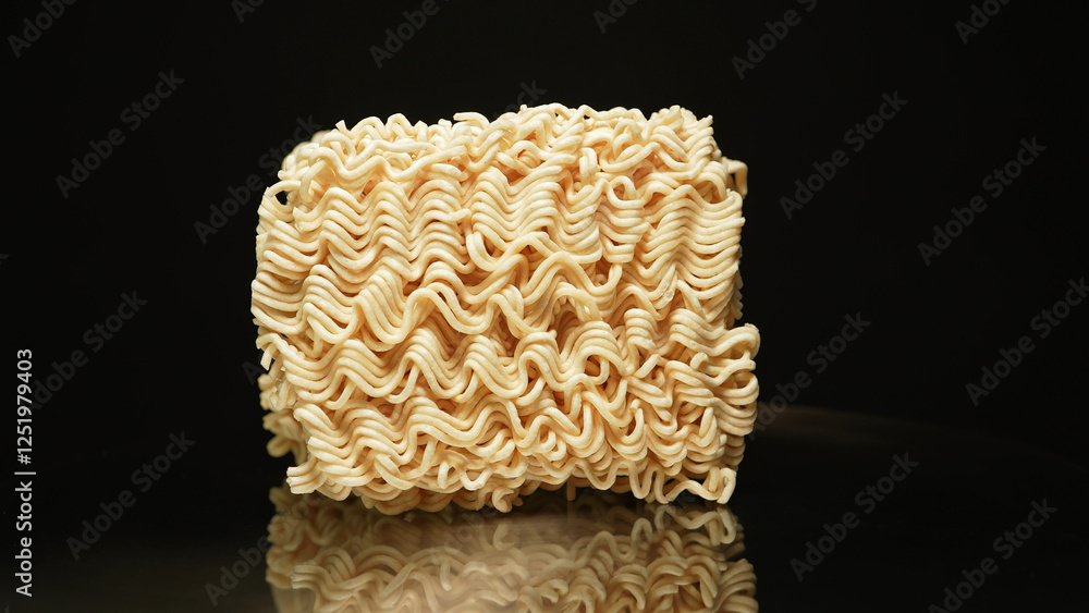 Instant noodle macro shot close up. Ramen noodle for quick soup. Fast food. Popular types of pre-cooked dried noodles. Student and office food made from wheat flour and water.