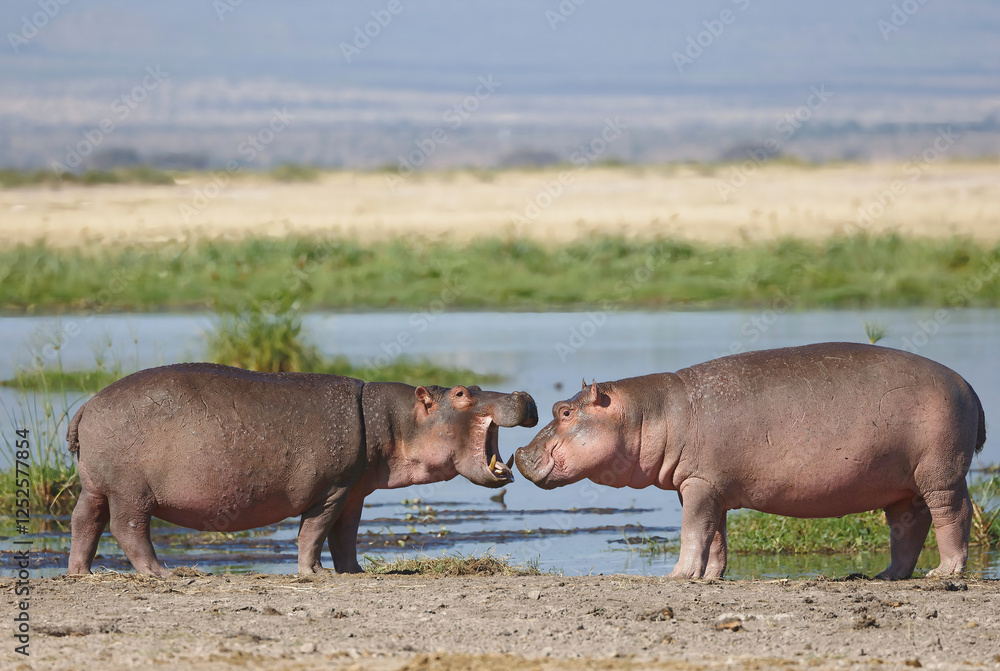 Two Hippopotamus closeup shot while fighting near water hole at Amboseli National Park,kenya