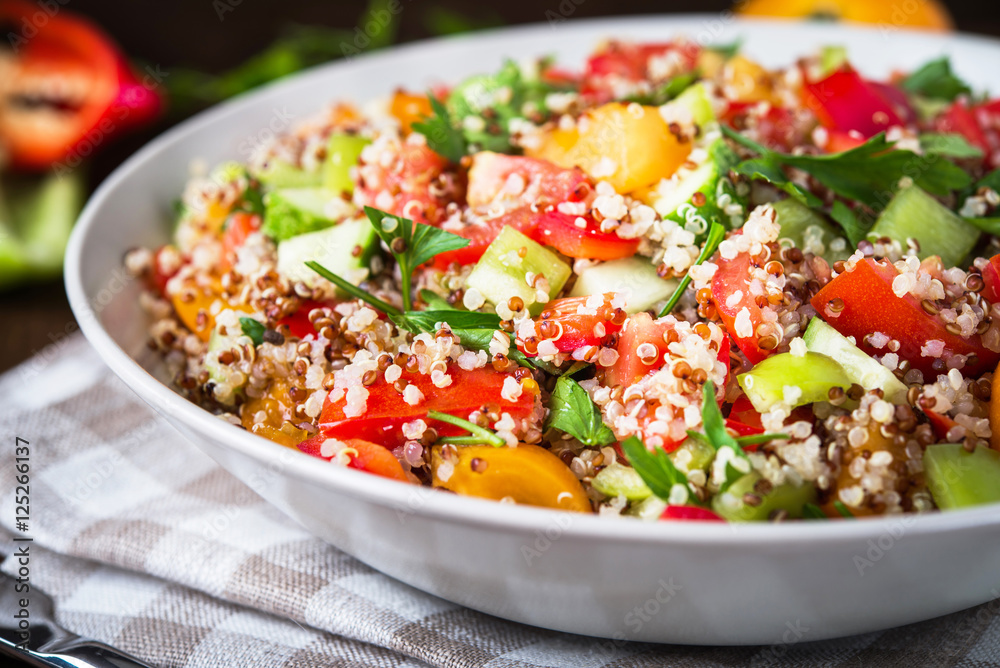 Fresh healthy salad with quinoa, colorful tomatoes, sweet pepper, cucumber and parsley on wooden background close up. Food and health. Superfood meal.