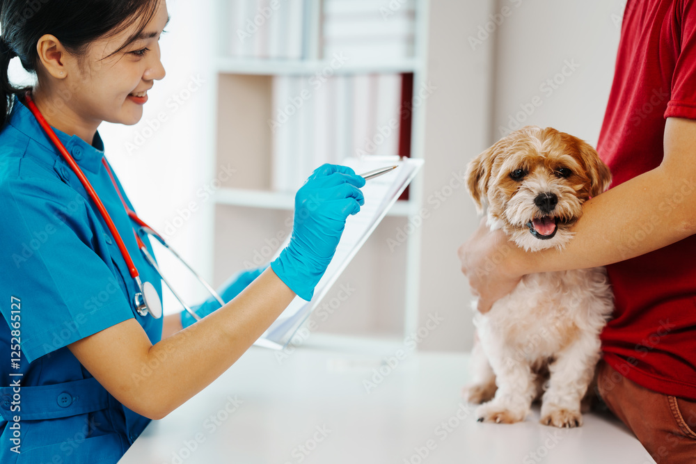 A man takes his sick small dog to the vet for a health check at the hospital desk. The veterinarian examines the dog and provides necessary medication for recovery