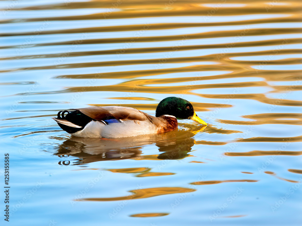 Male mallard duck with water reflections in soft late autumn light in Somerset England