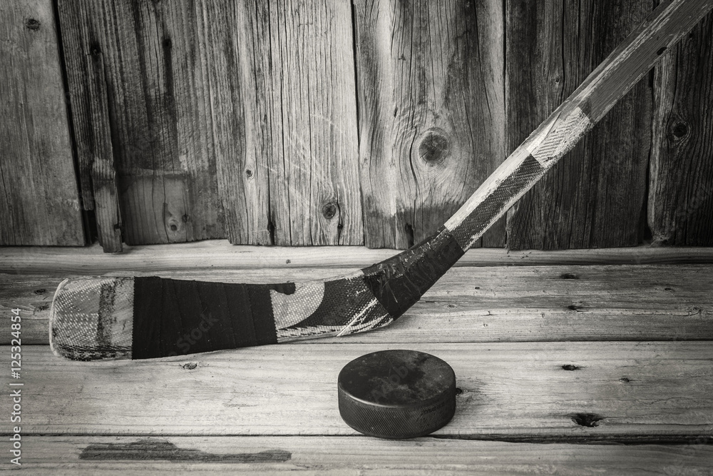 horizontal sepia image of an old vintage hockey stick with an old puck on a rustic old wood board background.