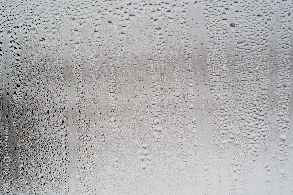 Drops of water on the glass, foggy window. Drops of rain, water condensation.