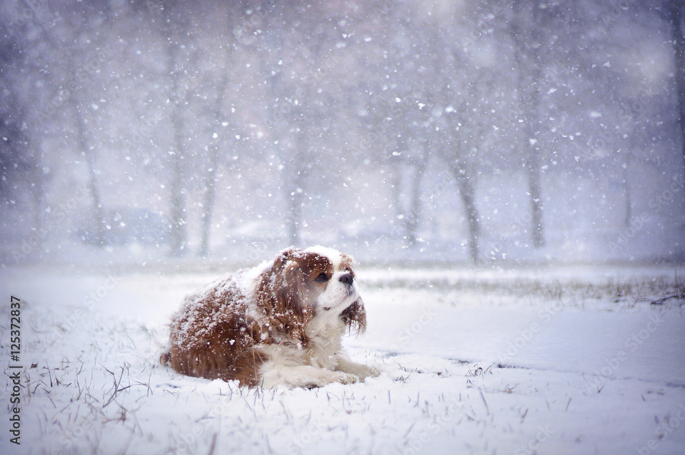 Beautiful cute dog Cavalier King Charles spaniel in the snow in winter on the street under the flakes of falling snow. Soft focus, blurred background. Merry Christmas and Happy New Year.