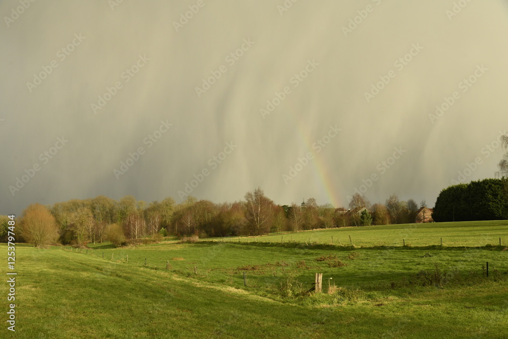 Au loin forte averse orageuse avec giboulée sur un paysage rural à Écaussinnes d'Enghien