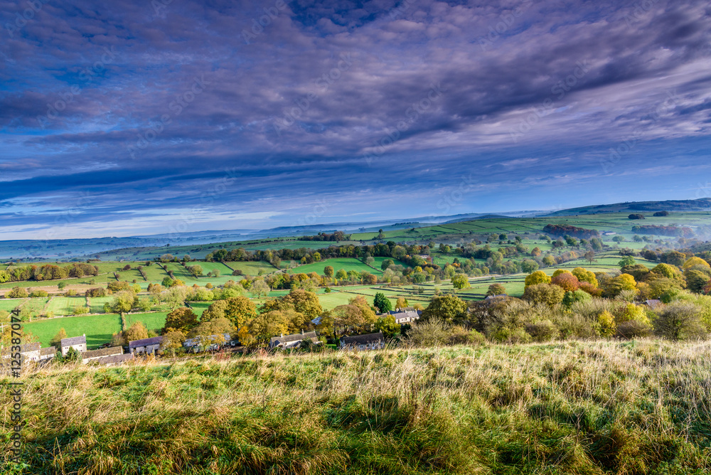 Beautiful countryside landscape near Taddington in Derbyshire, UK - typical English panorama of a rural area, mist in the far background - wide panoramic shot