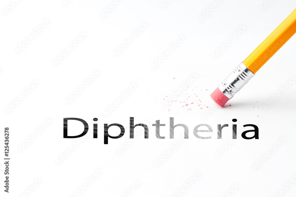 Closeup of pencil eraser and black diphtheria text. Diphtheria. Pencil with eraser.