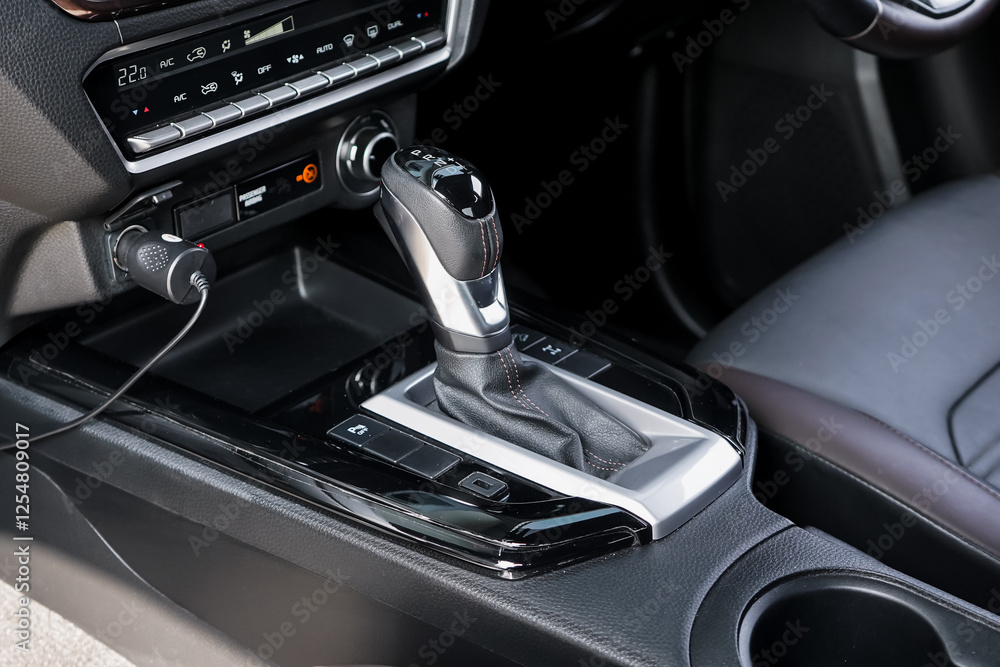 automatic transmission shift selector in the car interior. Closeup a manual shift of modern car gear shifter. 4x4 gear shift
