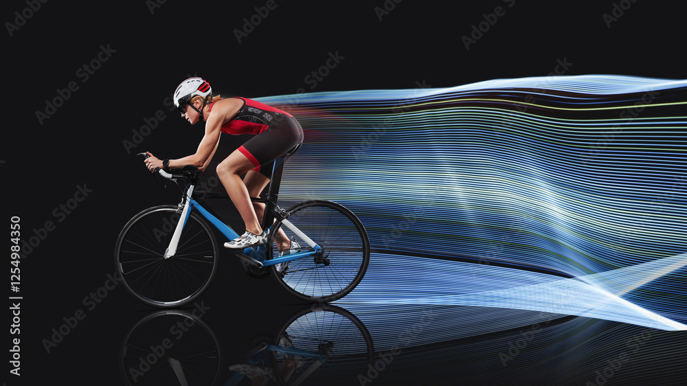 Cyclist in sportswear and sport helmet riding road bike isolated on black background. Concept of sport, triathlon, competition, tournament, championship and speed.