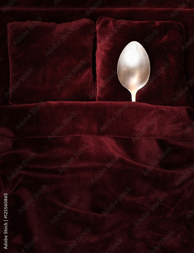 The original concept of the idea of a spoon are in a beautiful luxurious exquisite velvet bed burgundy maroon. Suitable for hotel and restaurant business.