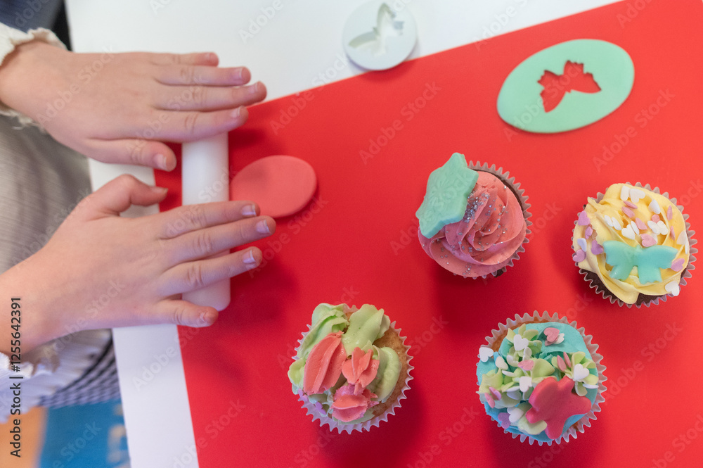 Young girl kneading decorating cupcakes during a baking class preparing muffins and cupcake for birthday party celebration