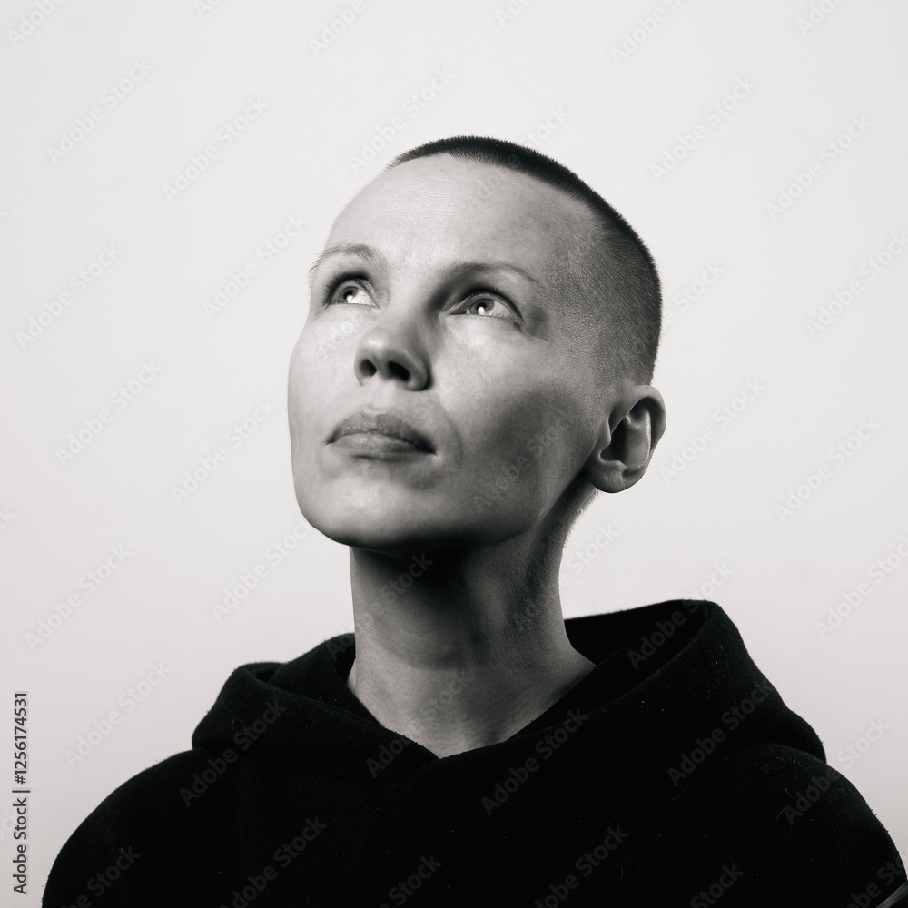 Contemplative caucasian female adult with shaved head in black hoodie