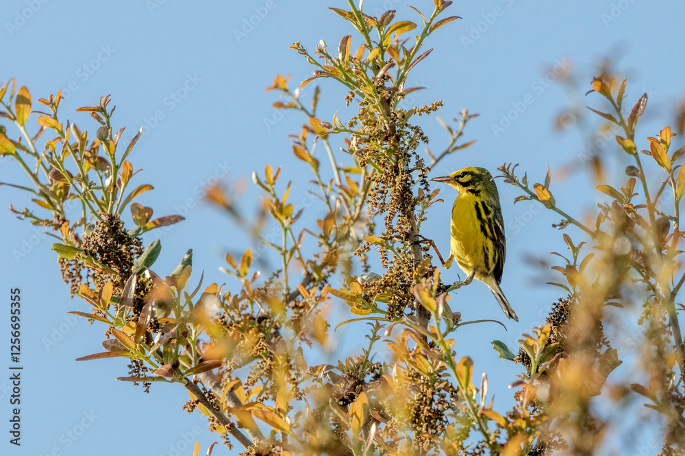 A vibrant yellow Prairie Warbler foraging for insects in a live oak tree