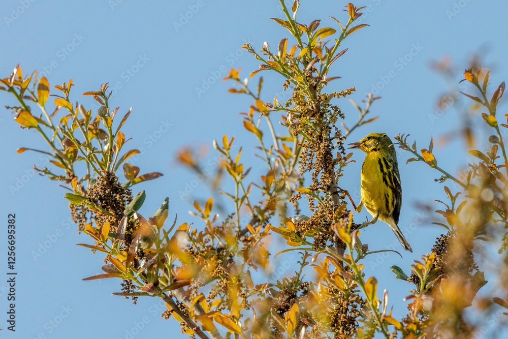 A vibrant yellow Prairie Warbler foraging for insects in a live oak tree