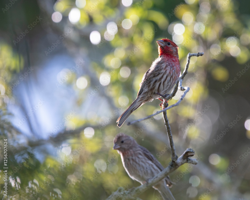 A male and female Purple Finch in a Live oak tree