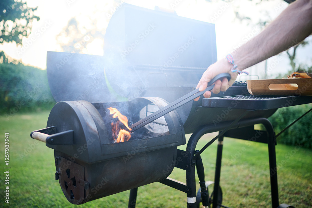 Unrecognizable man uses tongs to handle burning charcoal on a BBQ with smoker box. Barbecue preparation before starting to cook in backyard at home.