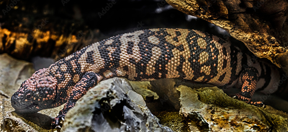 Gila monster lizard betweeb the stones. Latin name - Heloderma suspectum