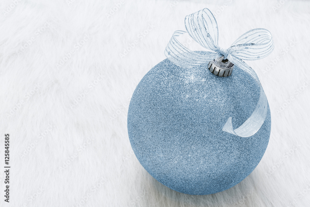 One beautiful, fancy, perfect, sparkly, shiny, blue glitter Christmas ornament on horizontal white background