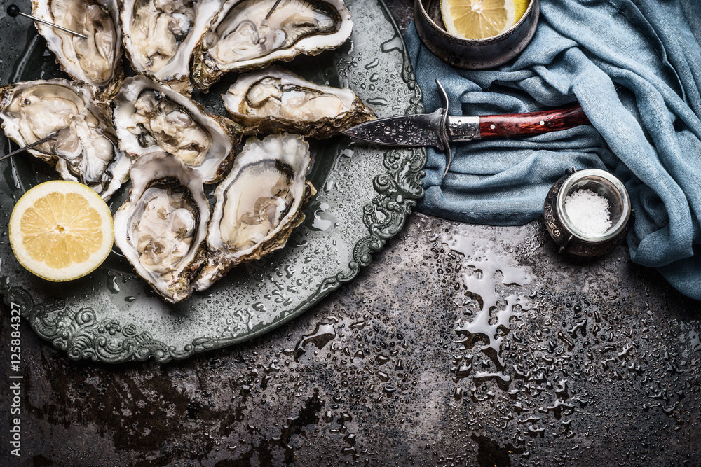 Open wet oysters on a plate with lemon and oysters knife, dark rustic vintage background, top view, border