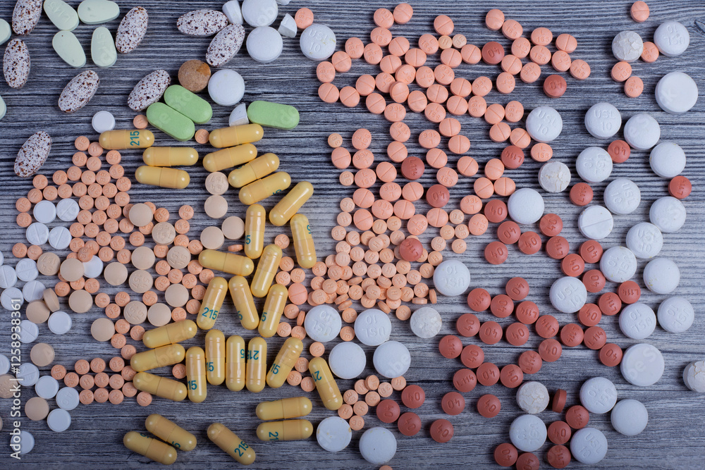 different pills on grey background