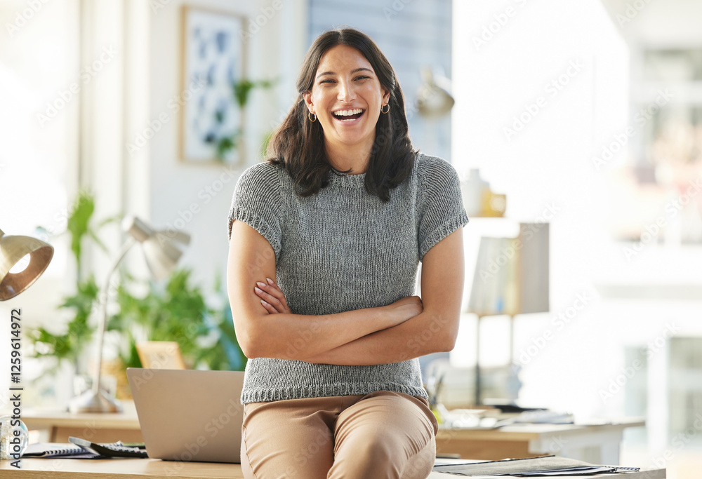 Woman, happy and arms crossed in office at startup with pride, confident and excited at media company. Person, writer and portrait at workplace, career and editing job at creative agency in Greece