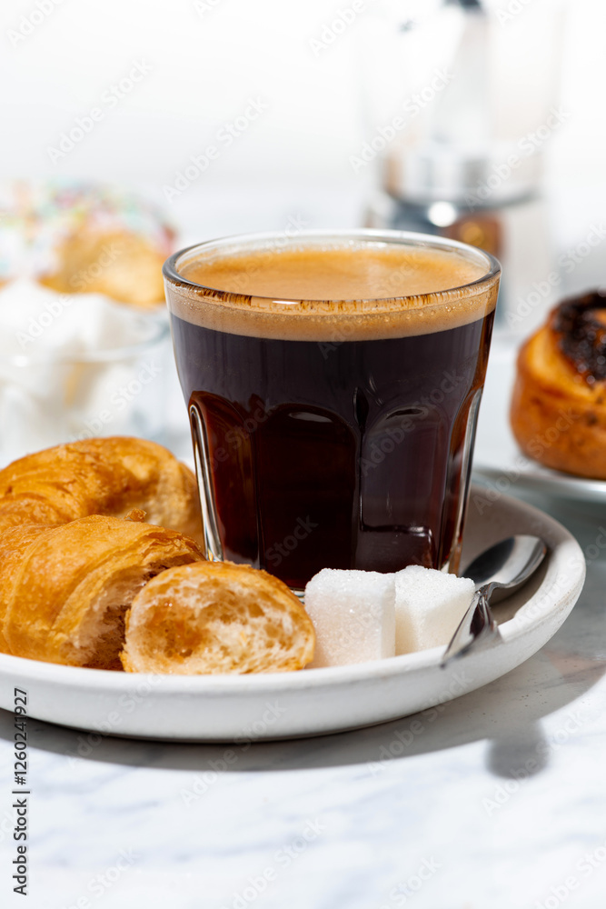 black coffee in a glass, mini croissants and a sweet bun, vertical