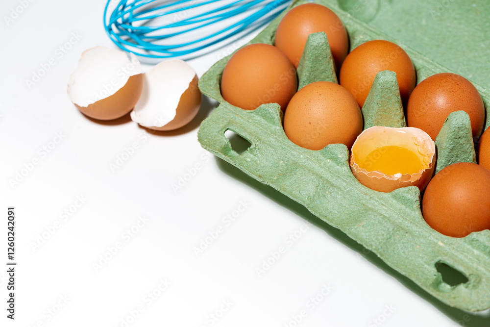 box of fresh chicken eggs, one broken egg and a whisk