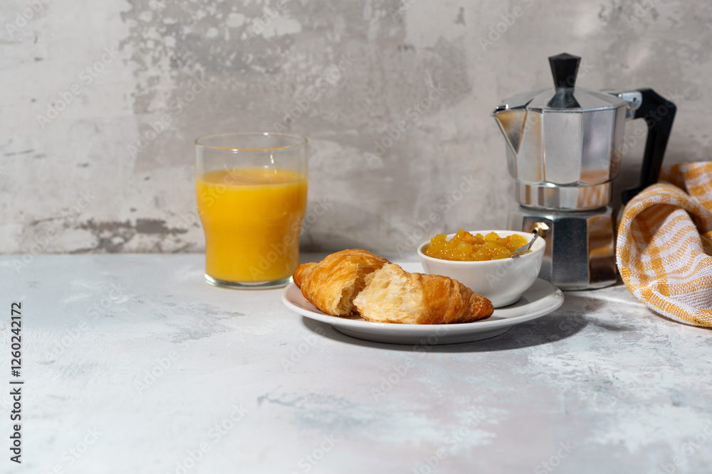 breakfast. fresh croissant with orange jam and coffee