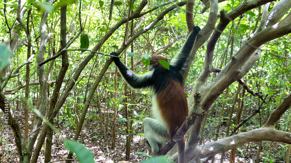 A Colobus Monkey Playfully Hanging and Swinging in a Lush and Vibrant Green Jungle Environment Zanzibar