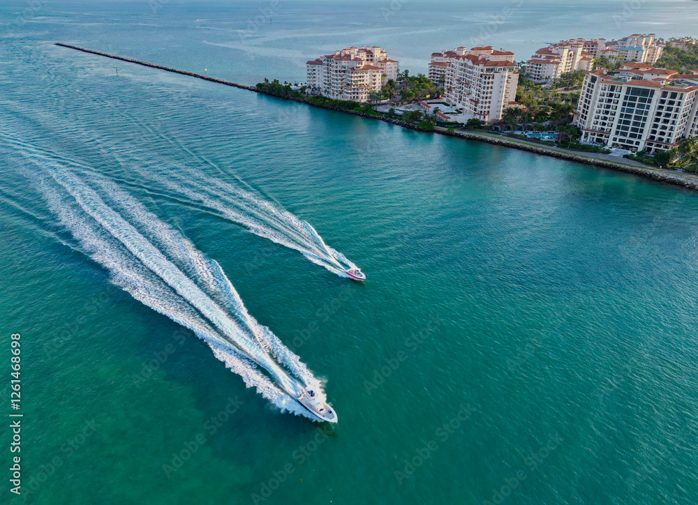 Yacht at Fisher island luxury residential building, aerial view. Vacation on summer. Fisher island building. Luxury boat motor yacht. Luxury yacht go to marina. Boating and yachting. Luxury lifestyle