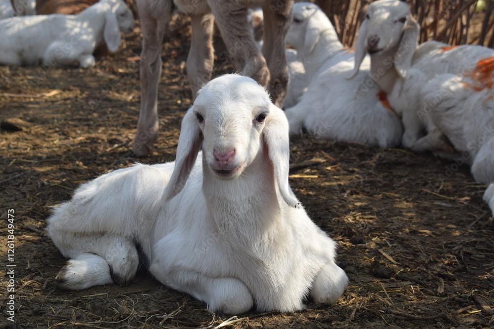 Cut out of young sheep lamb nature background looking at camera. Side view full body length. Innocence and sacrifice concept .No people.Flock of Staring Sheep