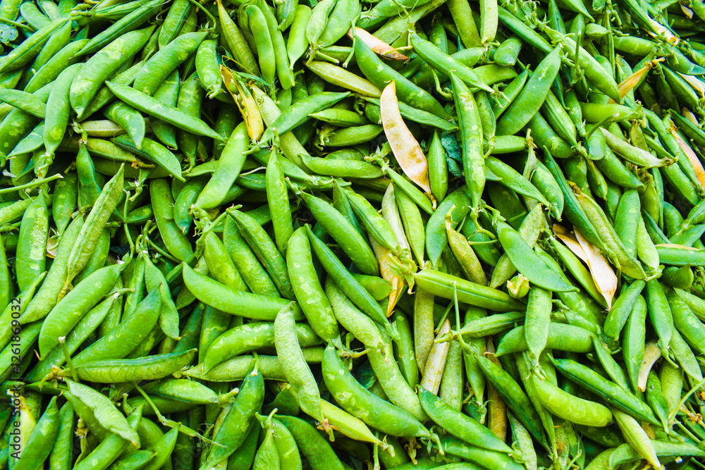 Fresh green sugar beans, Green pease, close-up, Fresh organic beans at an open air farmers market.