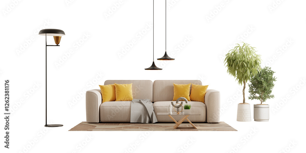 Front view sofa and plant in a living room on transparent background- 3D rendering