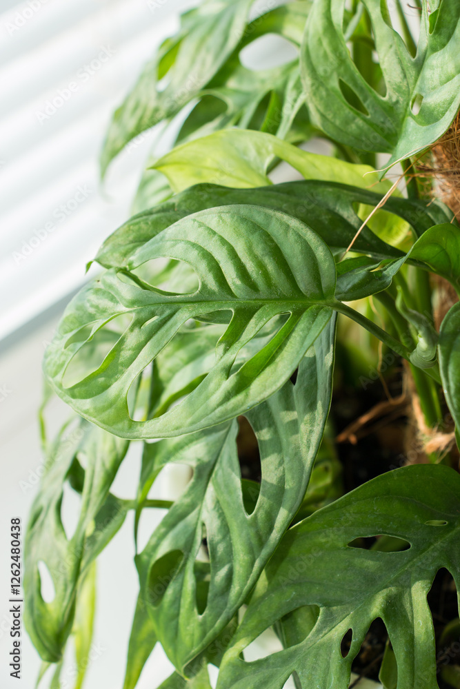 Tropical plant monstera monkey mask on a sunny windowsill. Home gardening concept.