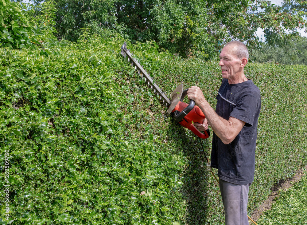 Friendly gardener in work clothes trimming thorny holly hedge with electric hedge trimmer in backyard garden enjoying work on warm sunny day,