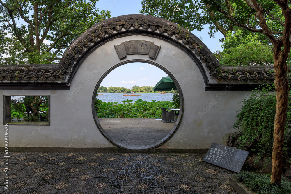 Traditional Chinese garden circular gate scene, Guozhuang at West Lake, Hangzhou, China