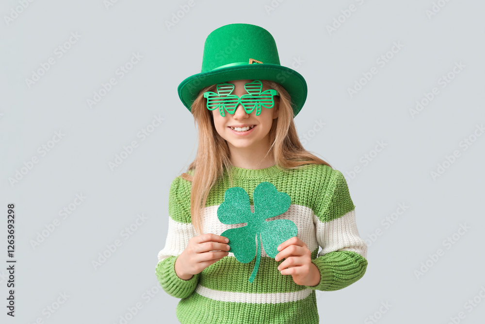Cute little girl in leprechaun hat and decorative glasses with clover on grey background. St. Patrick's Day celebration