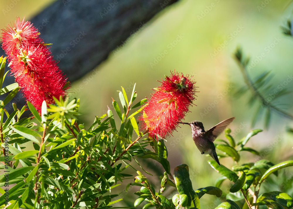 Ruby-throated Hummingbird nectaring from a vibrantly red Bottlebrush plant