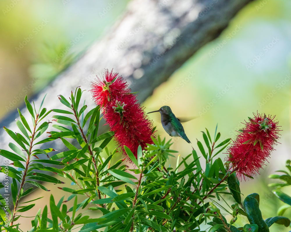 Ruby-throated Hummingbird nectaring from a vibrantly red Bottlebrush plant