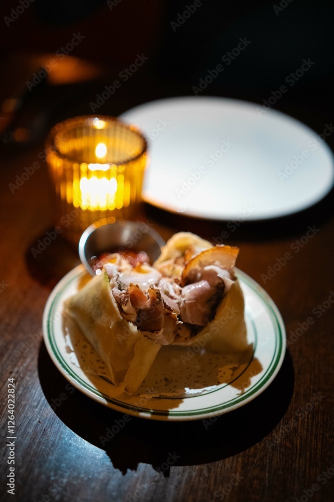 small snack wrap sandwich as appetizer at michelin star restaurant in italy