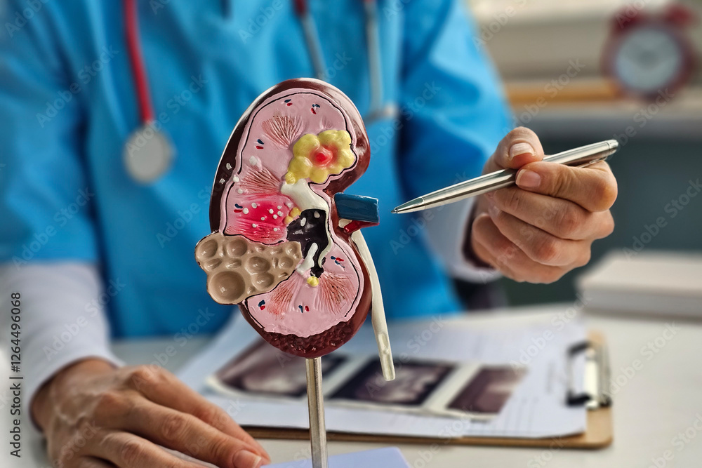 Doctor holds a plastic mock-up of a human kidney, closeup