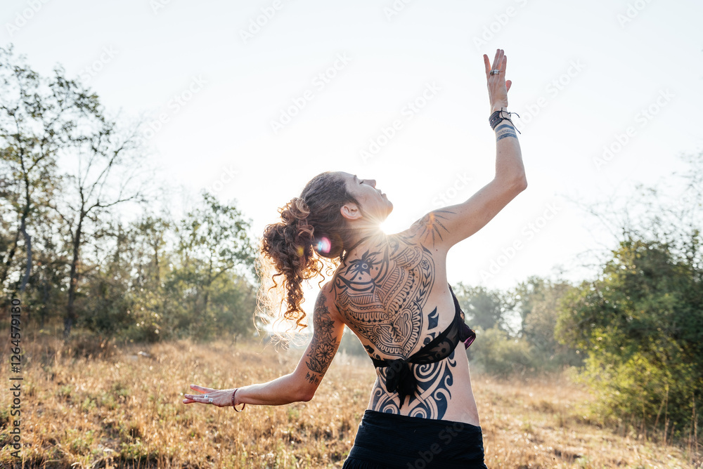 Tribal Dancer Poses With Tattooed Back Against Sunlight in Natural Setting